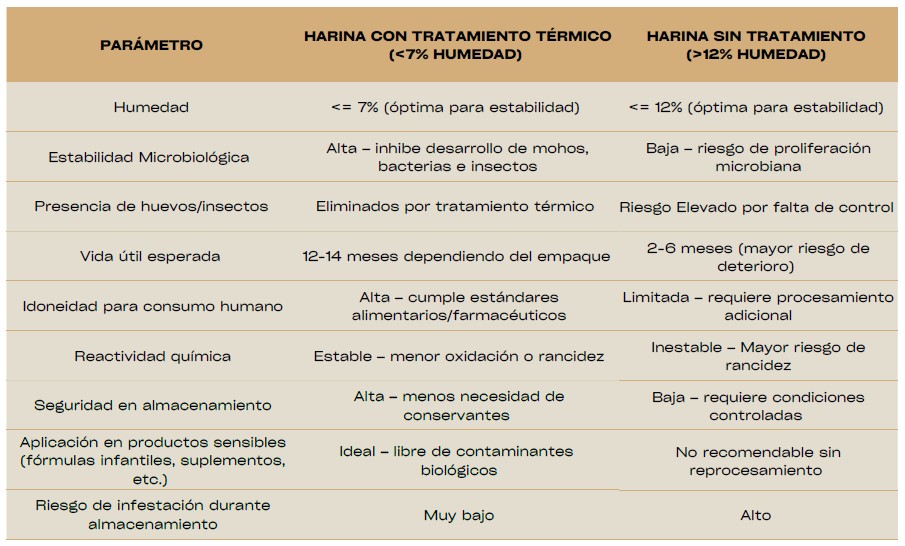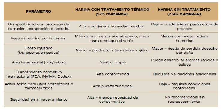 En contraste, la harina sin tratamiento térmico presenta riesgos logísticos, sanitarios y de estabilidad que limitan su uso directo en productos sensibles, exigiendo reprocesamientos adicionales para cumplir con estándares de calidad e inocuidad